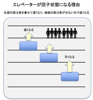 集団で移動する群れにおいて、先頭が遅く、後尾が早くなったら、団子状態が生じるのは当たり前である。だからエレベーターは、はじめは均等に動き出しても、次第に団子運転に陥っていくのだ。