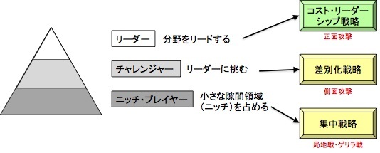 たとえば市場における競争戦略は、その会社の立場によって異なる。チャンピオンの戦略と、挑戦者にとっての戦略と、ニッチプレイヤーの戦略は異なる。あなたのところの会社は、チャンピオンかな、それとも挑戦者か、ニッチプレイヤーなのかな?