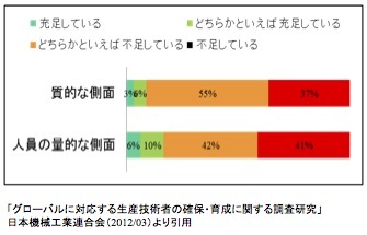 証拠もあります。これはやや古い調査ですが、日本機械工業連合会による「グローバルに対応する生産技術者の確保・育成に関する調査研究」(2012/03)から引用した図です。それによると、生産技術者が「不足している・どちらかというと不足している」と答えた企業は、合計で