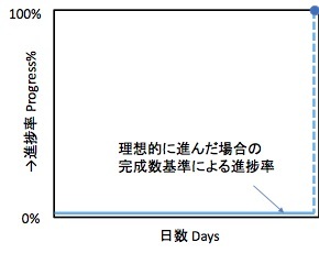進捗率のグラフは、ずっと0%のまま29日目までx軸にはりついていて、30日目にいきなり100%になる。このグラフを見て、完了日の予測ができるだろうか? 理想的にプロジェクトが進むと、完了時点が予測できなくなるような基準は、役に立つだろうか。