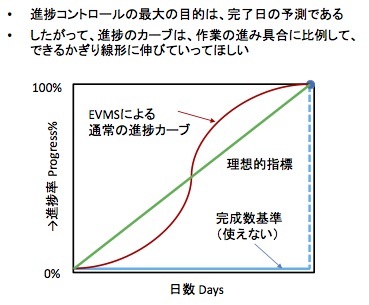 これに対してEVMSの進捗カーブの形は、通常、もう少しS字カーブ型になる。プロジェクトの最初はゆっくりと立ち上がり、やがては活況に入ってぐんぐんと進捗があるが、最後の方になるとまたカーブが寝て、ゆっくりとした収束になる。だからプロジェクトの一番初期と、一番最後の頃は、EVMSの進捗率から完了日予測を正確にするのは難しい。しかし両端の時期を除けば、まあまあ予測には使える。こういうこともあって、EVMSの進捗率計算は広く使われている(少なくとも欧米では)。