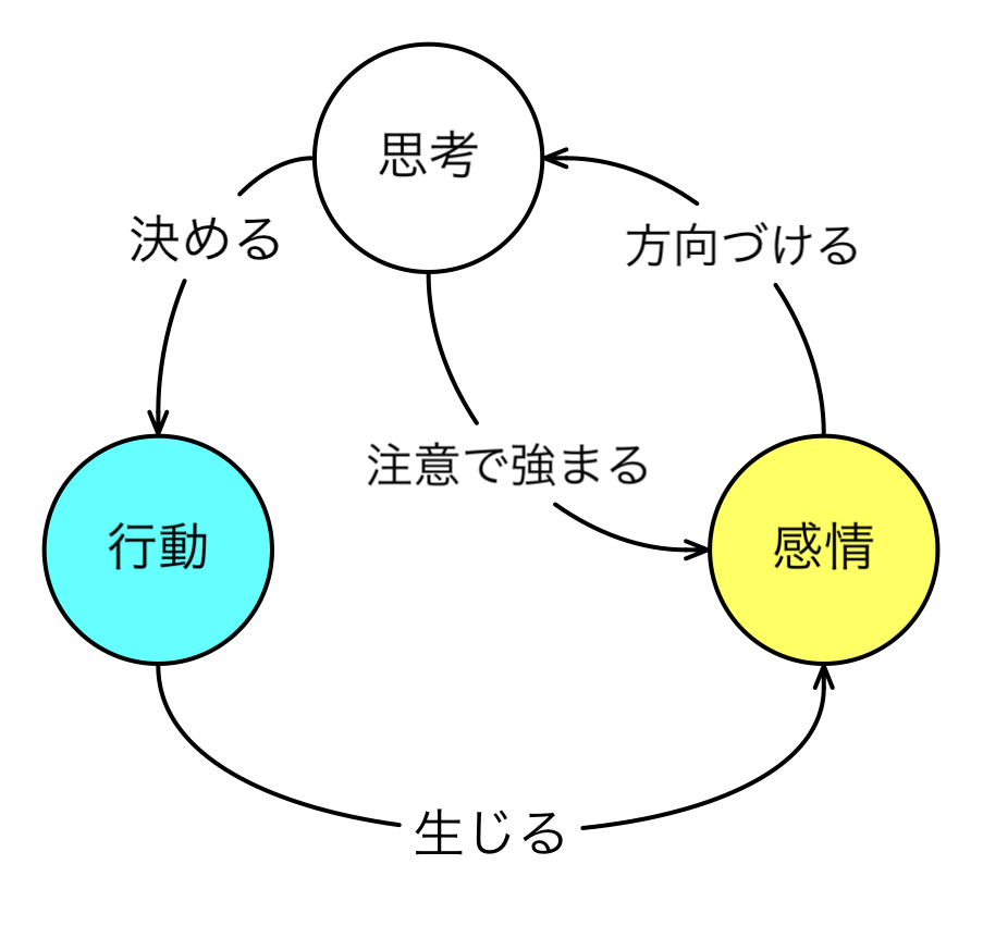 ふつう、人間は、思考→行動→感情→思考、というサイクルの中にいる。考えた結果が行いになり、行いの結果生じる事態に感情を抱く。そして感情は思考を方向づける。だから何か恐れを抱くような物事があっても、「気にしておく」だけにして、行動を変えることが、遠回りに見えても必要なのだ。