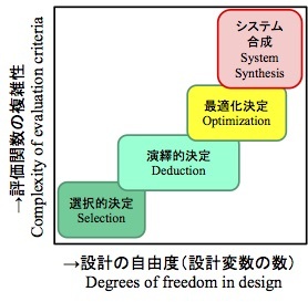 つまり、設計とは、与えられた制約条件の中で、複数の評価尺度を、なるべく最大化するような設計変数の組を見つける作業である、ととらえることができる。ORの分野の用語でいいかえると、設計とは多目的最適化問題なのである。