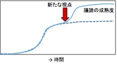下の図は、以前「どうどう巡りの議論を避けるために」に描いたものの再掲である。ディスカッションでは、視点が限られているため、ある時間を超えるとだんだん煮詰まっていってしまう。しかし、そこに新しい視点が加わると、また一段レベルがあがるケースが多い。