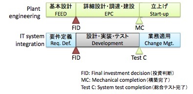 プラントの場合、建設を終え、溶接などの品質検査と機能テストを終えると、このEPCの構築段階は終了になる。これをMechanical Completion = MCと呼ぶ。ちょうどITシステムの結合テスト・総合テストの完了にほぼ相当する。ここでプラントは顧客に引き渡され、立上げ(Start-up)段階に入る。そして実際の原料をプラントに導入し、操業の人員を配置して、100%稼働になるまで立ち上げていく。パフォーマンス・テストなどもここで行われる。