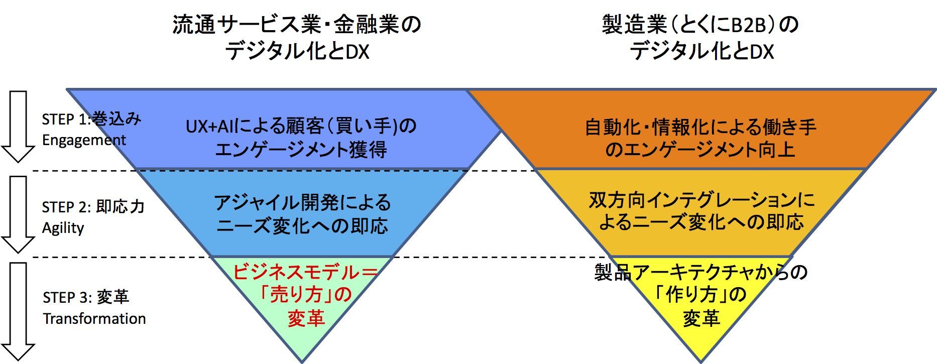 標準化「さっき品管さんが言ったように、デジタル化はそれ自体が目的じゃない。手段のはずでしょ。で、戦略コンサルの今日の講演によると、流通サービス業や金融業のデジタル化ってのは、ビジネスモデルの変革が目的だって事だ。つまり『売り方の変革』だね。」