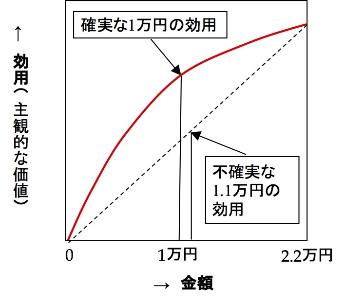 ところで、効用は上に凸のカーブのため、横軸2.2万円のところの高さは、1万円の値の2.2倍よりも小さくなる。だから、右の壺を選ぶ「賭け」で期待できる効用は、1万円の確実な効用よりも小さくなってしまう。このために、多くの人は、リスクのある賭けを回避して、確実を選ぶのである。