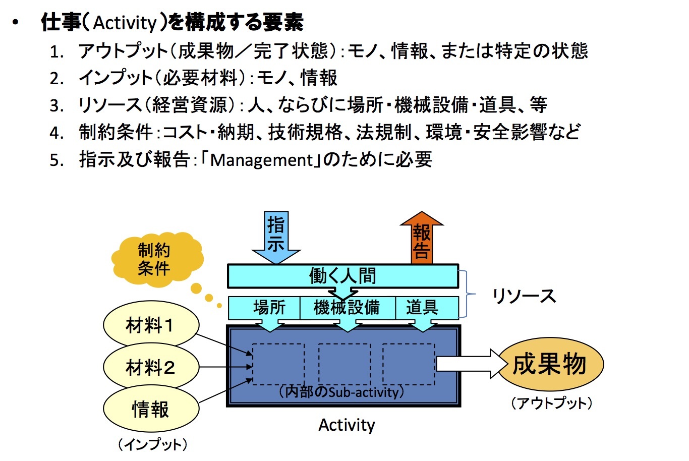 なお、Activityの内部には、さらに下位のSub-activityが並んでいて、それが仕事のプロセスを構成しているかも知れない。そういう意味で、Activityは階層的に分解可能である。ただし内部のSub-activityは通常、外部に対しては「遮蔽」されており、いわば、任されている状態にある。マネジメントにおける指示と報告の単位では、原則としてアウトプットの結果のみを問うことになる。