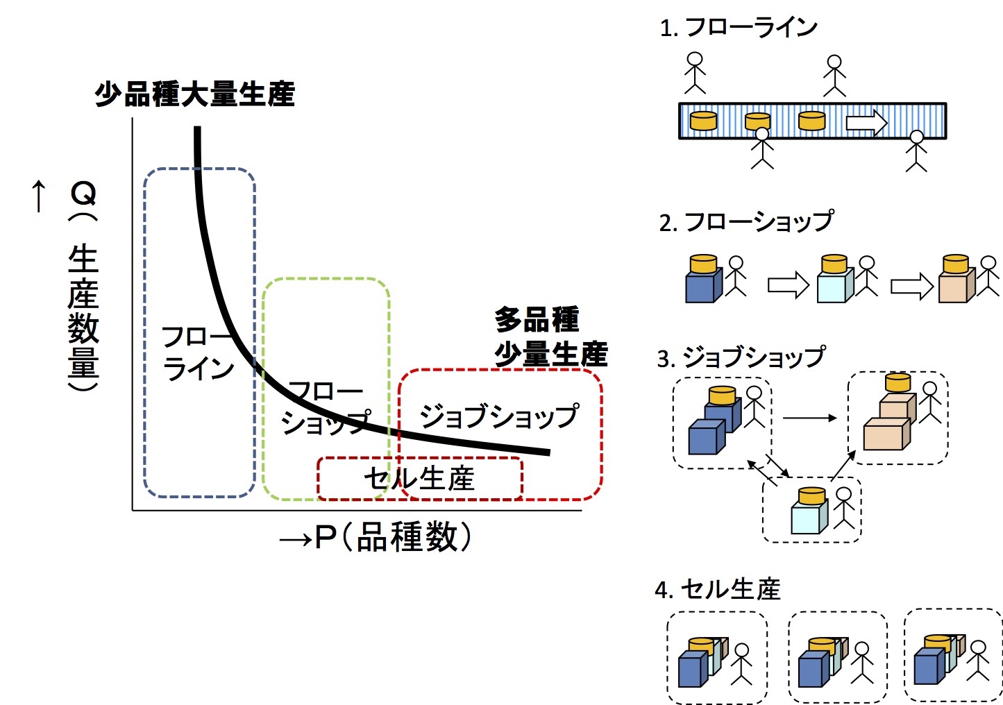 上記の内、(1)品種数と生産数量については、横軸に品種数(P: Product)をとり、縦軸に生産数量(Q: Quantity)をとってプロットする「P-Q分析」が、よく用いられる。品種数Pが少なく生産数量Qが大きいものは、「少品種大量生産」で、図では左上に位置する。逆に、品種数Pが多く、生産数量Qが小さい場合は、「多品種少量生産」になる。図では右下に来る。