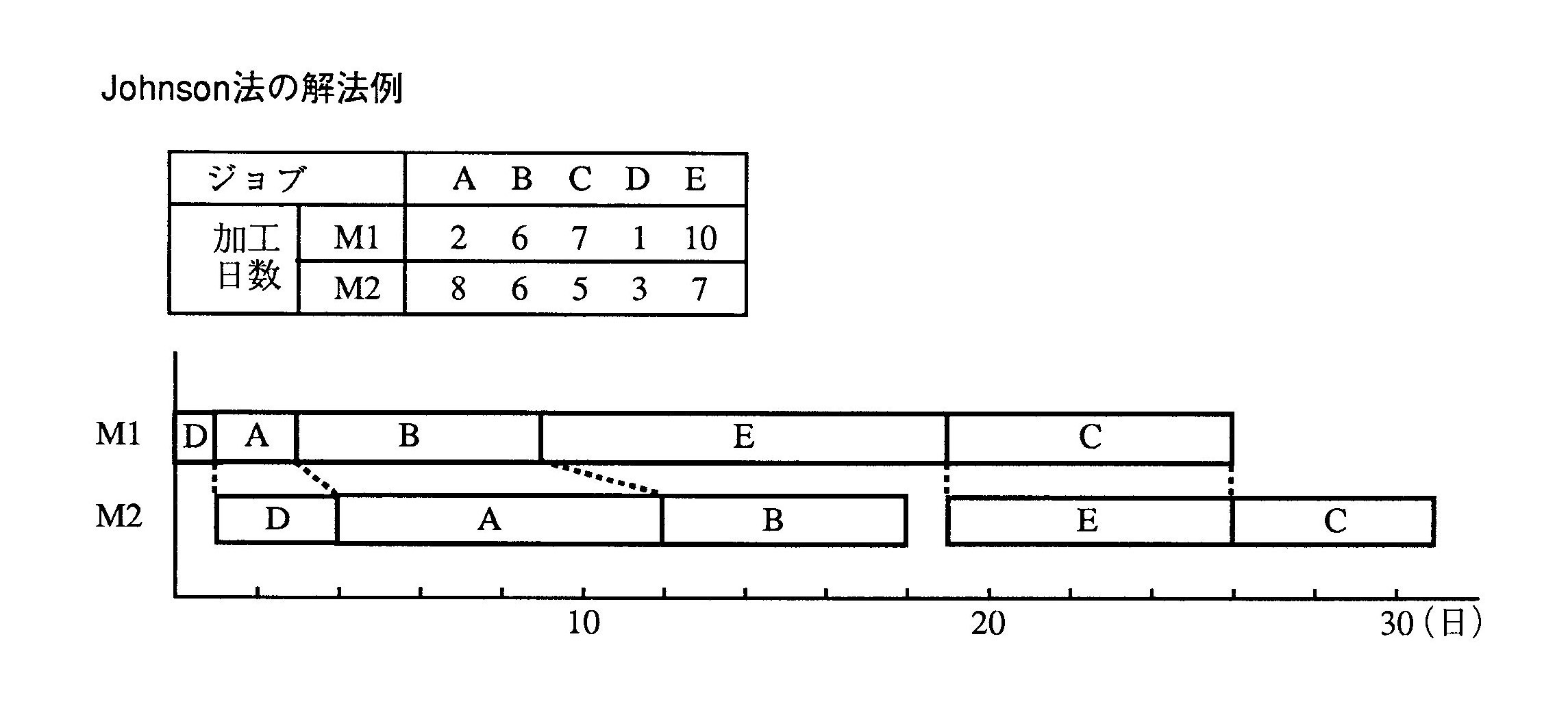 「今日はまず、ジョンソン法の話から始めましょう。ジョンソン法は、生産管理の本などには必ずのっている、古典的なスケジュ ーリング理論の手法です。ある意味では古典的理論の成果といってもいいでしょう。今、2段階の工程からなる製造過程を考えます。ジョンソン法は、この2段階の工程に複数の生産オーダーが出ているとき、どういう順序でやれば全体の作業期間が最短になるかを教えてくれます。具体的には以下の手順で順序付けを行います。(1) 未決定の生産オーダーのうち、工程作業時間が最短のものを選ぶ。(2) その作業が第一工程なら未決オーダー群の着手順の最初に、また第二工程なら最後に割付ける。(3) そのオーダーを、未決オーダー群から削除し、(1) に戻る。こうして未決オーダー群がなくなったら終了です。この例では、2つの工程の加工の順序が決まっていますが、製造作業の内容によっては加工の順序を逆にしてもいいものがあります。そのような工程を、ランダム・ショップと呼びます。工程の順序が決められていて変えることができないものは、フロー・ショップと言います。ジョンソン法はフロー・ショップの順序付け手法ですが、これをランダム・ショップに拡張したものがジャクソン法です。ジョンソン法の考え方を、自由度という観点から解釈するならば、作業時間の最も短いものから順に端に置いていくのですから、『自由度消費が最小になるような順序で着手順を決めよ』ということになります。さて、このジョンソン法の成り立つ条件は、次のようなものです。・すべてのタスクの作業時間が確定していること(1点見積り)、かつその見積りどおり変動なく実行できること・すべてのタスクの納期が同じであること、ないし納期(の優劣)は気にしないこと・すべてのタスクが着手可能であること (EPST = Earliest possible start timeが同じ)・タスクが後から次々飛びこんできたりしないこと・2工程であること (3工程以上には簡単に拡張できない)このように条件をならべてみると、ジョンソン法が実務上使える範囲はきわめて限られていることがわかります。数学的に最適性が保証されているので理屈としては面白いですが、実用上の価値はほとんどないといっていいでしょう。」