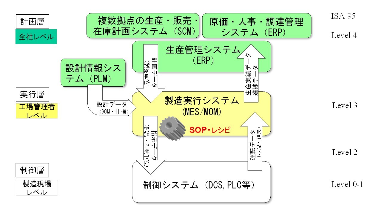 (さらに、もう少しMES周辺に詳しい人なら、SOP/レシピの管理だけじゃなく、保全管理のCMMSとか、製造履歴データ保管のHistorianとか、ラボ情報のためのLIMSとかも、MESの領域じゃないか、と指摘されるだろう。まさにそのとおりである。これらも「製造マネジメント」の仕事の一部だからだ)