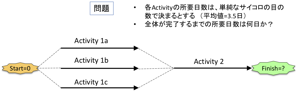 ただし、アクティビティが着手してから完了するまでの所要日数には、普通ばらつきがある。ここでは単純に、実際の所要日数はサイコロを転がして、出た目の数で決めることにする。2の目が出たら、2日かかるとする訳だ。サイコロの目は1から6まであるから、平均値=(1+2+3+4+5+6)/6 = 3.5日になる。
