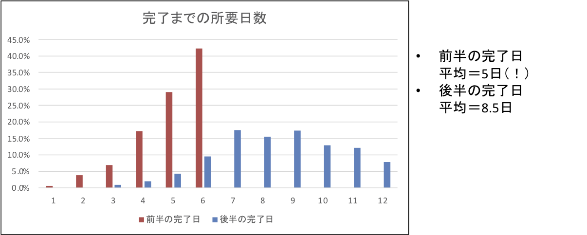 ちなみに、前半の工程の完了日の平均は、3.5日ではなく、5日だった。下の図が、その結果を集計したグラフである。