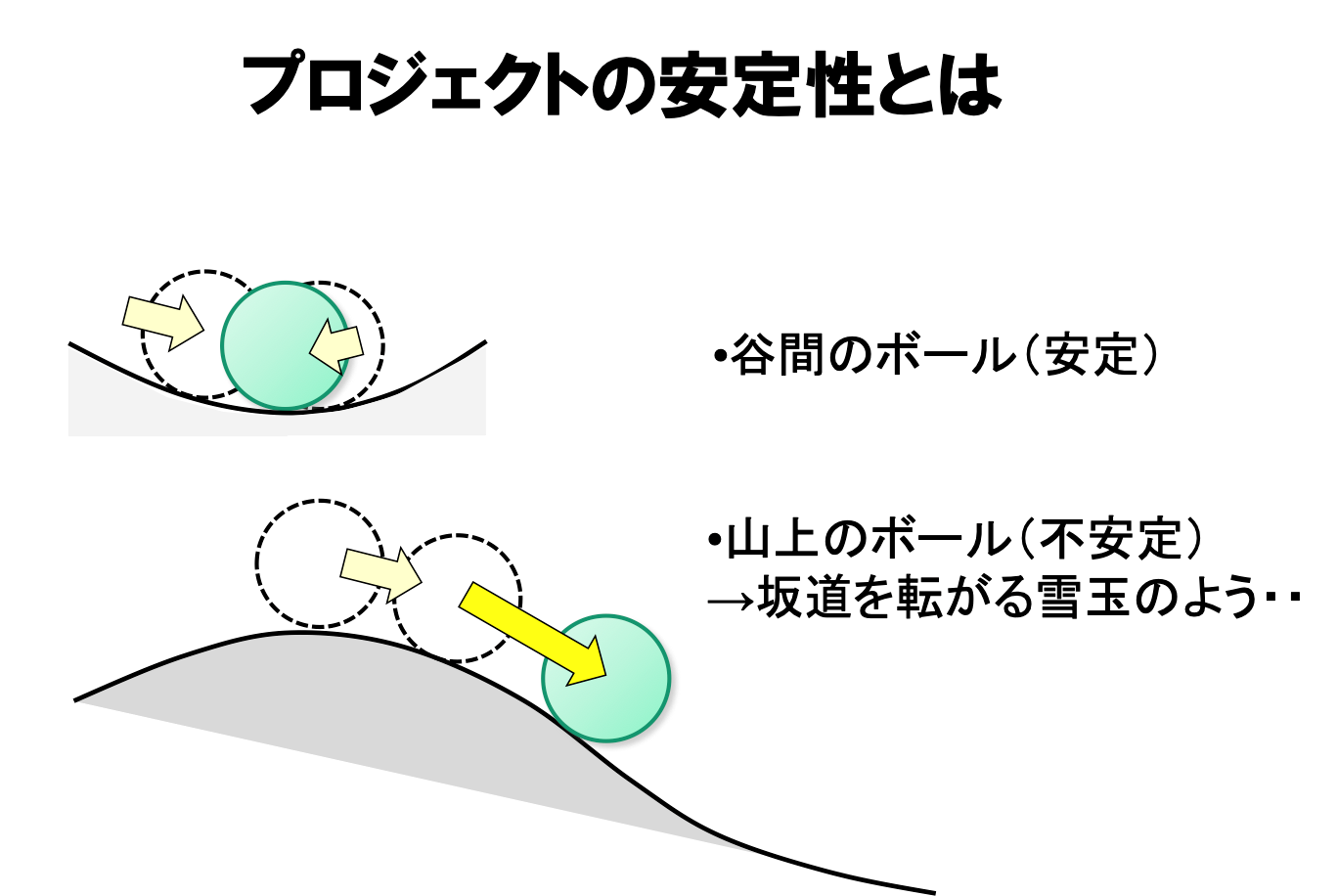 その仕事を続けるうちに、わたしは、プロジェクトとは山上のボールのようなものだと、感じるようになった。谷間に置いたボールは、左右どちらの方向から力を受けても、元の位置に戻るような性質がある。安定なのだ。しかし、山の上に置いたボールは、左右どちらかからちょっとでも力を受けると、逆の方向に転がり、いったん転がりはじめると、その方向に加速度をつけて進んでいく。