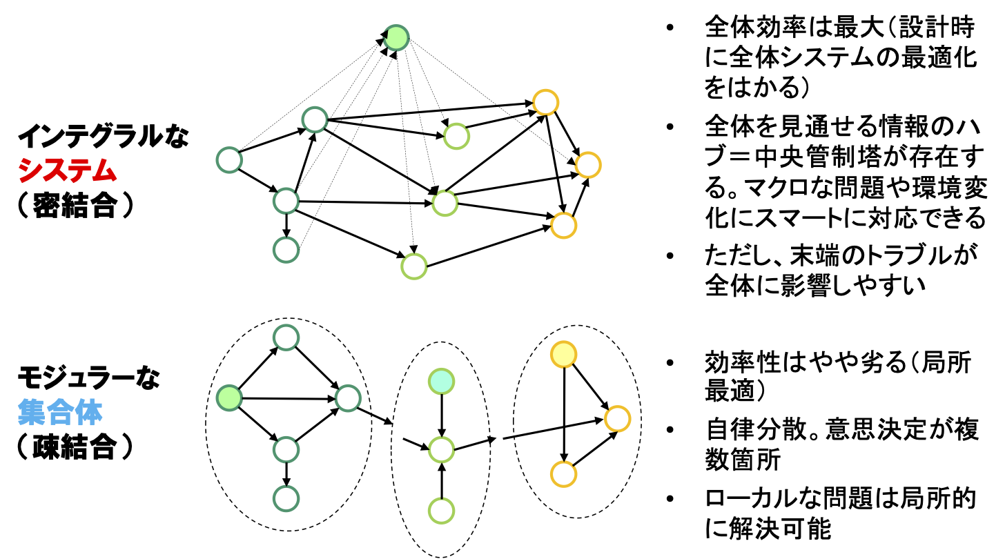 これに対し、図の下側はモジュラーな疎結合の集合体を表します。比較的独立した要素グループ間が緩やかにつながっており、それぞれが局所最適で動くため、全体の効率性はやや劣ります。自律分散で、意思決定が複数カ所で行われるのが特徴です。そのかわり、ローカルな問題が局所的に解決可能な点が長所です。
