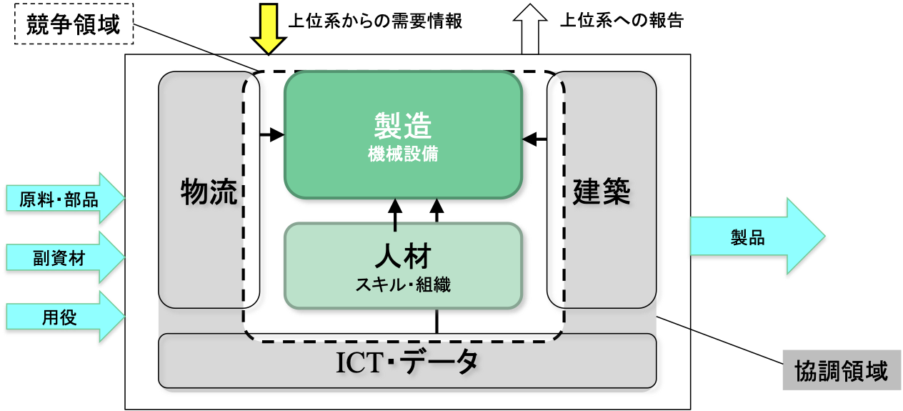 そのシステムは、働く人々と、製造のための機械設備と、物流設備、それらを支える作業空間(建築)と、情報をやりとりするICT・データ、などの構成要素から成り立っています。