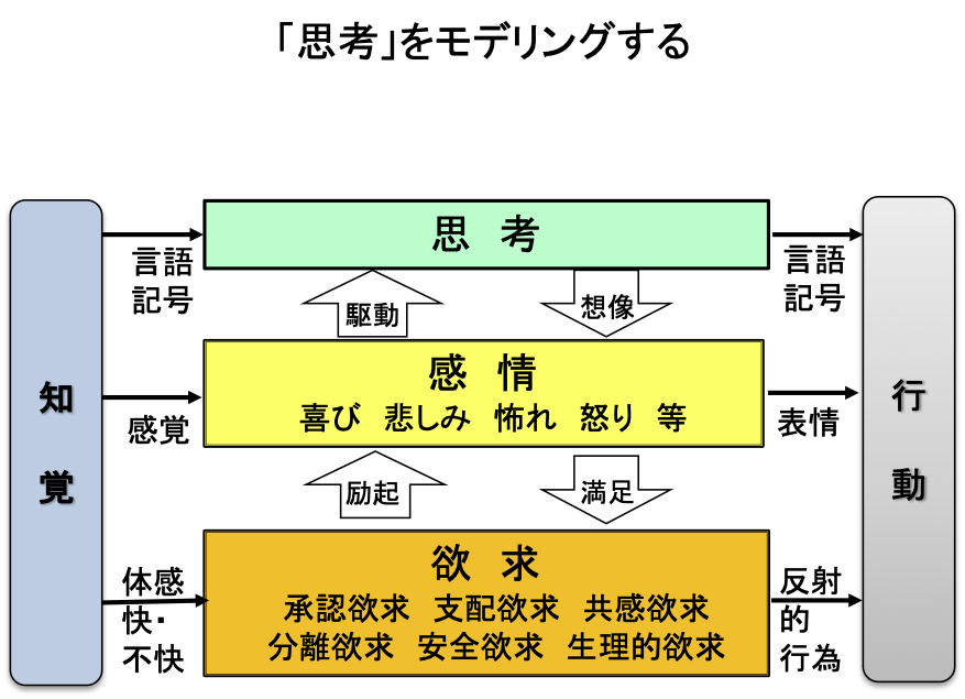 真ん中にはプロセスがあるが、これは思考と感情と欲求の3層構造になっている。そして右側には、アウトプットとしての「行動」がある。アウトプット行動には、言語や記号を書いたり話したりするほかに、顔や表情・口調などが伴うし、さらに身体の様々な反射的あるいは意識的な動きが付随する。