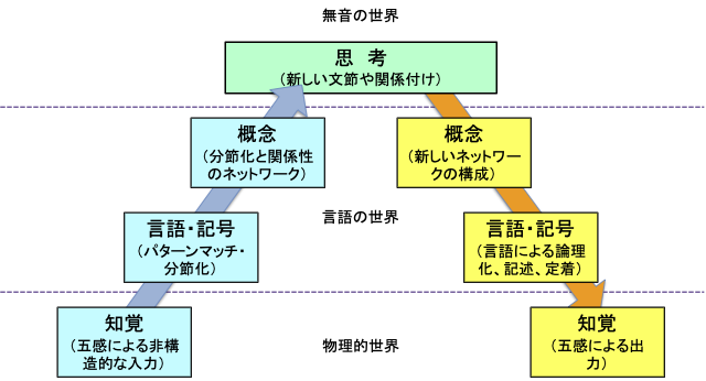 一番下に、物理的世界がある。ここは非構造的な、未分節の情報の海だ。ここから、言語・記号などの助けを借りて、パターンを見出し、分節化していく。言葉や記号は、概念に一対一で対応している。概念と概念のネットワークが、いわばわたし達が「思考」を表現する形式だ。ここまでは言語の世界である。英語で夢を見ているときは、ここが「英語モード」的に働いているらしい。