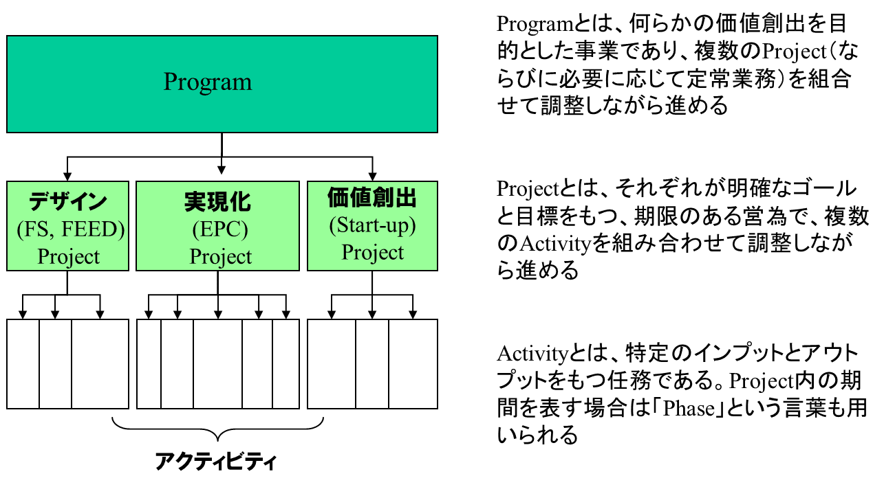 プログラムとは、何らかの目的(多くは能力獲得や価値創出)を達成するための活動で、複数のプロジェクトを組合せ、調整しながら進める。プロジェクトとは、それぞれが明確なゴールと目標をもつ、期限のある営為で、複数のActivityを組み合わせて調整しながら進める。そしてActivityとは、特定のインプットとアウトプットをもつ任務である(プロジェクトを構成する期間を表す場合は「フェーズ」とも呼ばれる)。