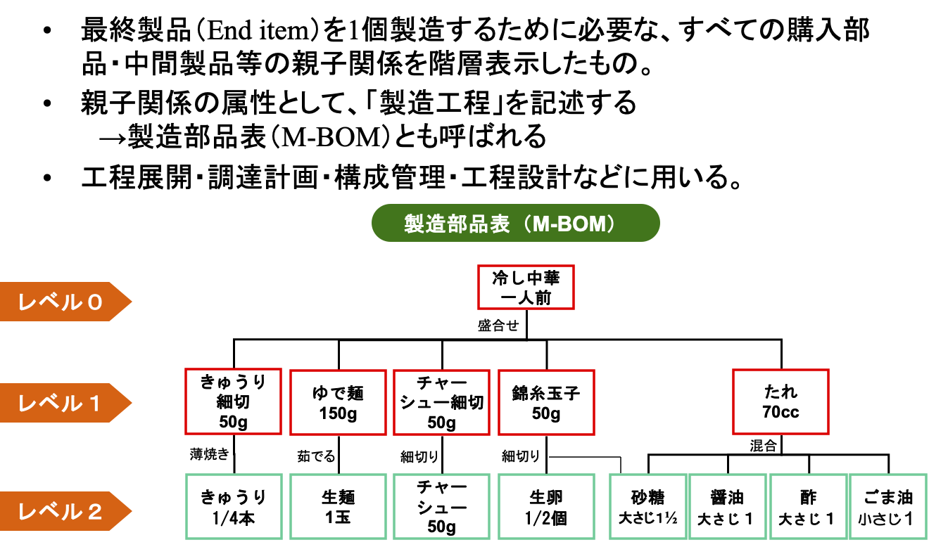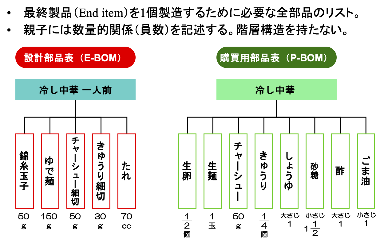 図を見てほしい。第1世代のBOMの典型例を示す。左にあるのは、『設計部品表』(E-BOM = Engineering Bill of Material)と呼ばれるもので、設計部門が、製品の機械組立図などに記載するものだ。もっとも図の例は、製品として「冷やし中華」を取り上げているので、組立図などは作らないかもしれないが、ともかく最終製品は、錦糸玉子50gと、ゆで麺150gと、チャーシュー細切り50g・・などを、お皿に盛り付けて(=組み立てて)作ることを示している。
