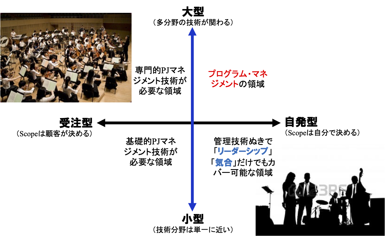 さらに、これが大型になると、専門的プロジェクト・マネジメントの技術が必要になります。そして上の右側になると、もうプログラム・マネジメントの領域になるんです。