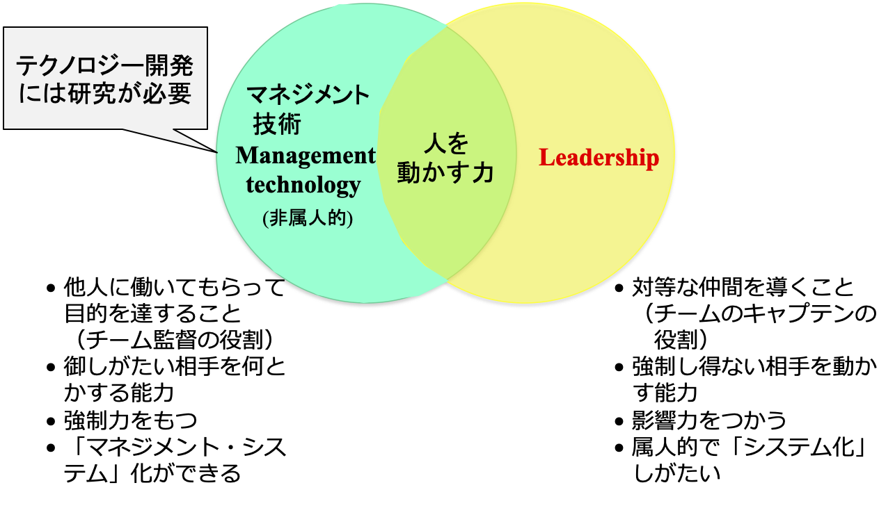 プロジェクト・マネジメントを議論する時に、もう一つ注意しなきゃいけないのは、リーダーシップとマネジメントの区別ということです。これも経営学の世界では、いろんな流儀の定義があるんですけど、とりあえずここではこういうふうに整理しています。
