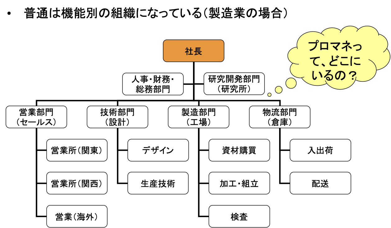 ところで、ほとんどの製造業は、機能別の組織になっている。1番上に経営者がおり、それを支える形で人事・財務といった本社機能と、研究開発機能があり、そしてライン業務を受け持つ部門が並ぶ。具体的には営業であり、技術、製造、物流などである。では、プロマネのいるべき部門はどこなのだろうか?