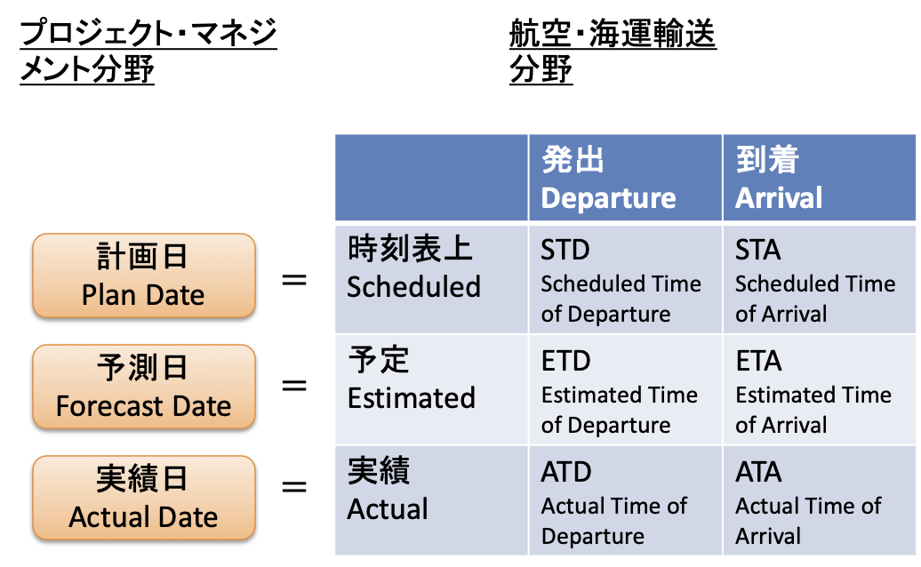 ところで面白いことに、サプライチェーンに関係する輸送業界では、よく類似した概念が存在する。海運や航空業界では、船や航空機の発着に関連して、2組・3段階の、合計6個の日付を使う。STD/STA, ETD/ETA, そしてATD/ATAである。