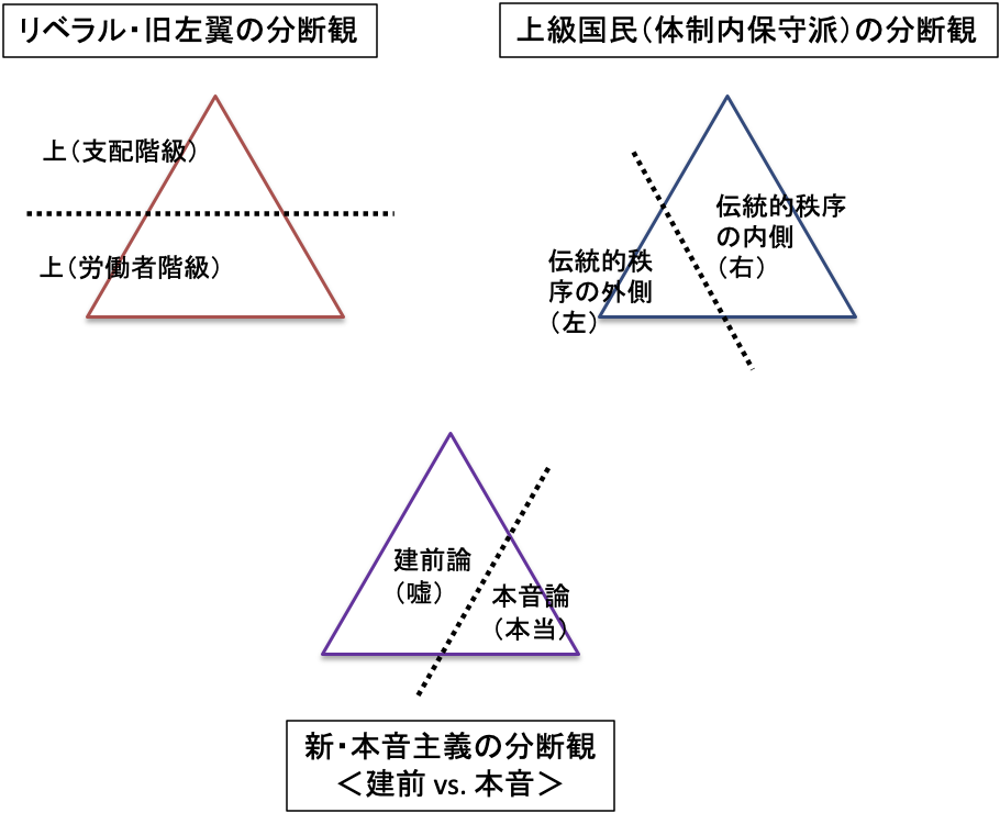 先ほどの図を見てほしい。新・本音主義派は三角形の右下隅に位置する。リベラル派も上級国民も、勝手に都合の良い線を引いて、右下を味方に取り込もうとしてきた。そんなのまっぴらだ、というのが彼らの感情である。
