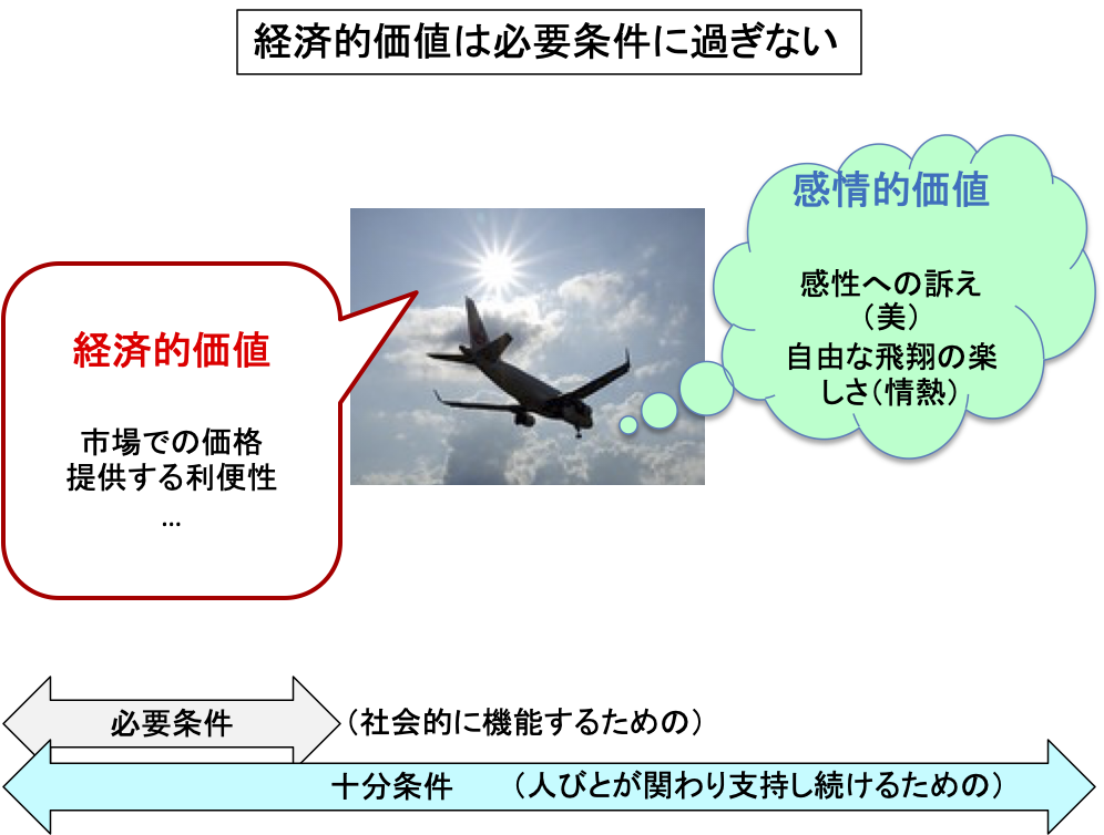 例えばあなたが、以前から欲しいと思っていた、カッコいい新車を買ったとしよう(クルマに興味が無ければ、カッコいい音楽用ガジェットでも、自家用ジェットでも何でもいい)。 あなたにとっての経済的価値は、それがもたらす時間の便益や、他人に転売したときに得られる値段だ。 しかし感情的価値とは、その流線的なカーブや色合いの美しさ、動かしたときの手ごたえの面白さ、自分のできることが広がる期待、そして所有者であることの誇らしさなどからなっている。