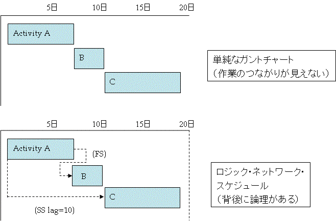 それがわるいと非難するつもりは毛頭ない。全然ガントチャートを描かないよりは、描いて計画のベースラインとするほうが、ずっと良い。しかし、それで十分だとは言えない。バー・チャートだけでスケジュール・コントロールするのは危険なのだ。なぜなら、単なる線表には、ロジックが無いからだ。プロジェクト・コントロールには、ロジック・ネットワーク・スケジュールが是非とも必要なのである。