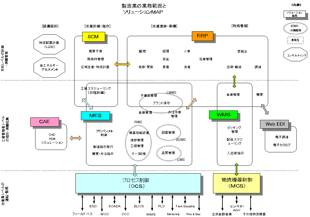 生産のマネジメントを支える情報システムのソリューションの位置づけを、上述の枠組みで考えると