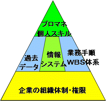 しかし、上位構造としてのPM個人の能力は、じつは中位構造によって支えられている。中位構造は、「プロジェクト遂行手順・WBS体系などの標準」、「プロジェクト・マネジメント・ツール(情報システム)」、「過去の実績データベース」の3要素からなっている。そして、これら中位構造は、下部構造としての「組織体制・権限関係」の上に成り立っているのだ。図にすると、次のような関係である。